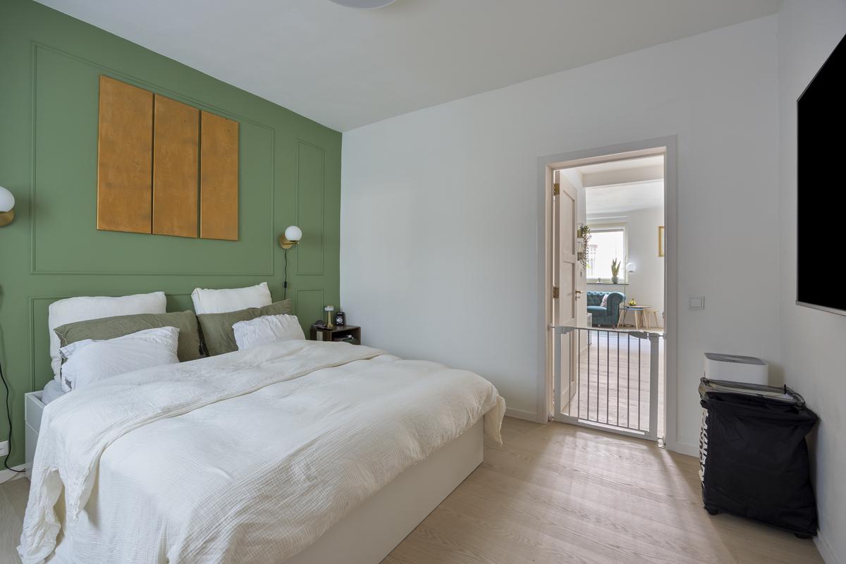De slaapkamer straalt rust uit dankzij de groene accentmuur.